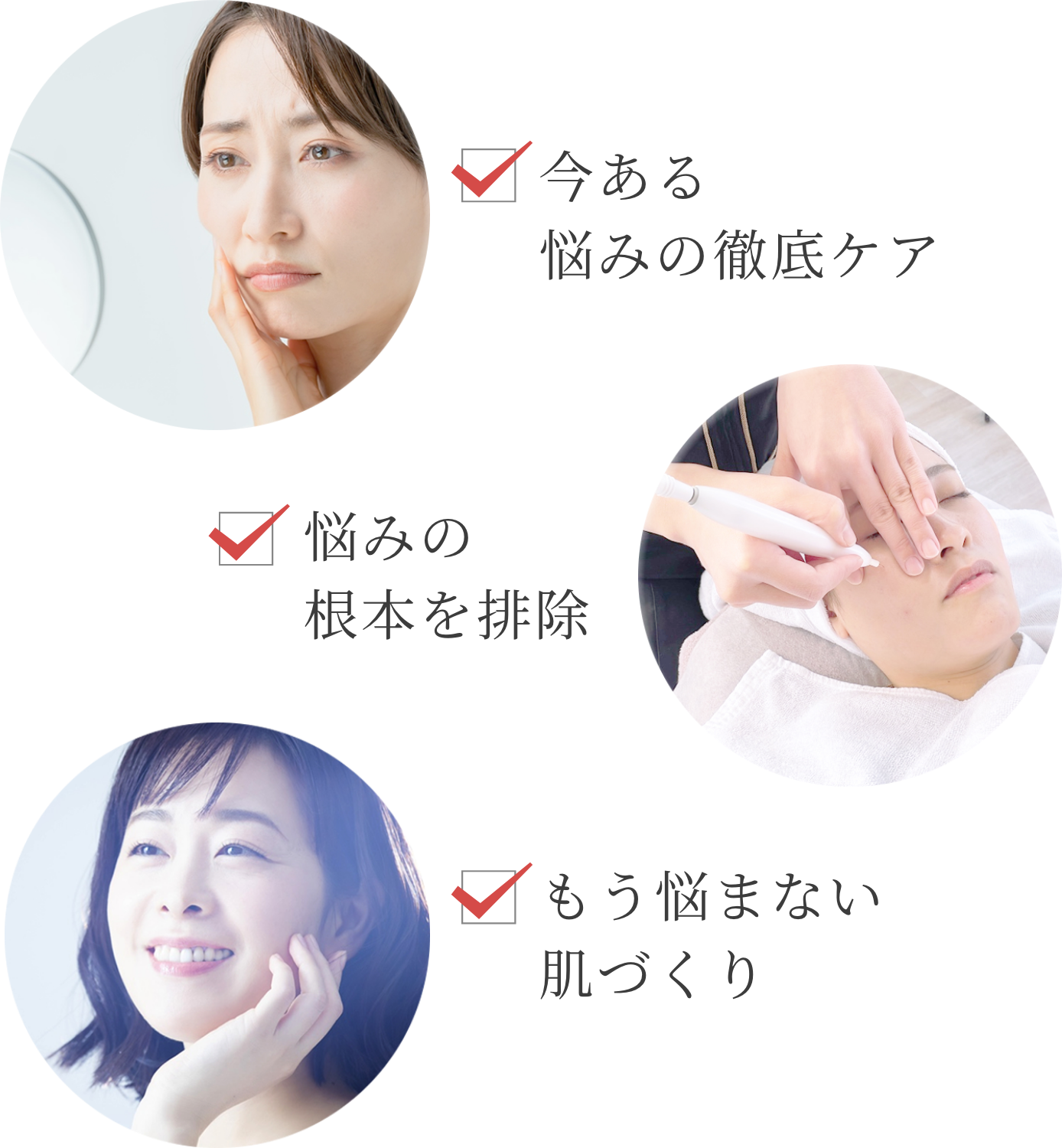 お肌のトラブルの原因はさまざまです。根本的原因を探り、お肌の状態を診させていただき、体験の内容をご説明していきます。